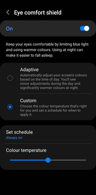When the eye comfort shield feature is enabled, you can either set it to adaptive mode where it will automatically adjust the screen's colors based on the time of the day, or custom your preferred color temperature and schedule a time to apply the change.